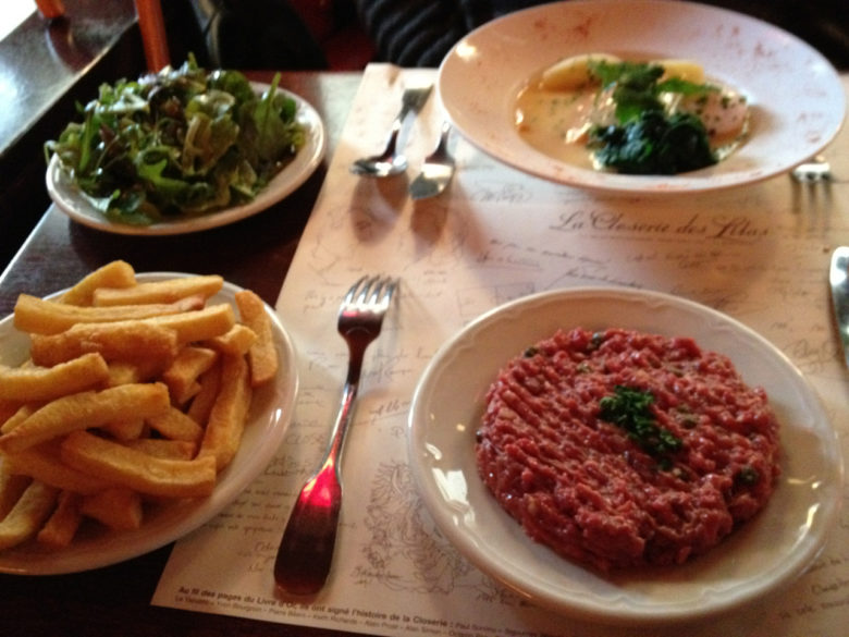 To keep up the new tradition, we started with champagne and progressed to Sancerre for the oysters, to be followed by mousseline of pike pour madame and steak tartare pour monsieur. The waiter wanted to make sure that “tourist boy” knew he was ordering raw meat, but I assured him my chef father had made it for us as children, which brought a smile to his face and a promise that the kitchen would make the finest steak tartare for me. And so they did…