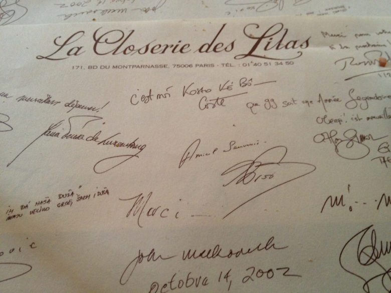 Towards the bottom of Luxembourg Garden I knew we would find the Closerie de Lilas restaurant. Time for a late lunch / early dinner. Hemingway fans will recognize the name, but it has also been the hangout for the whole Parisian world of arts and letters from Cézanne to Picasso, Bacall to Gainsbourg. It’s been there since 1847 and still going strong.